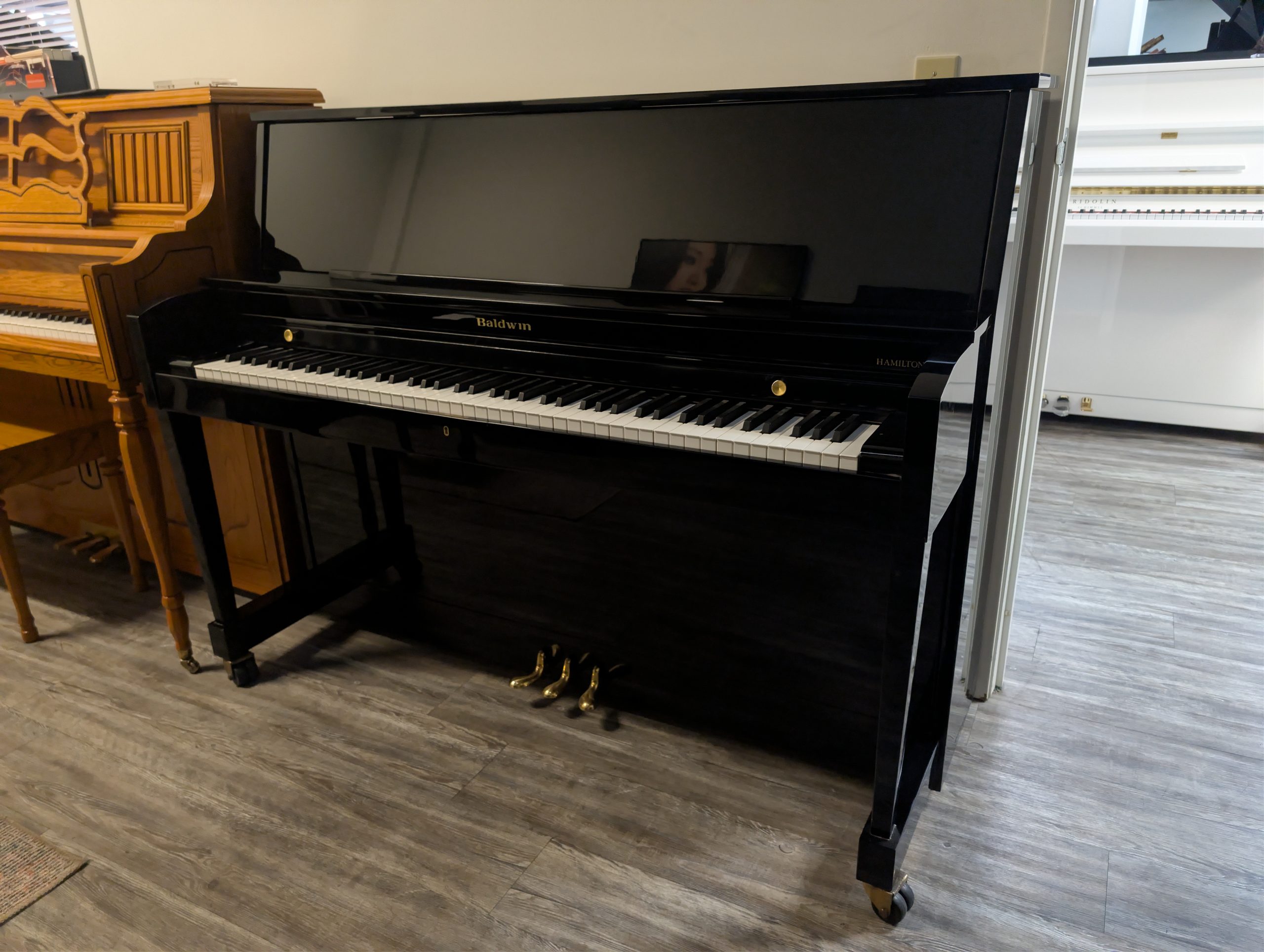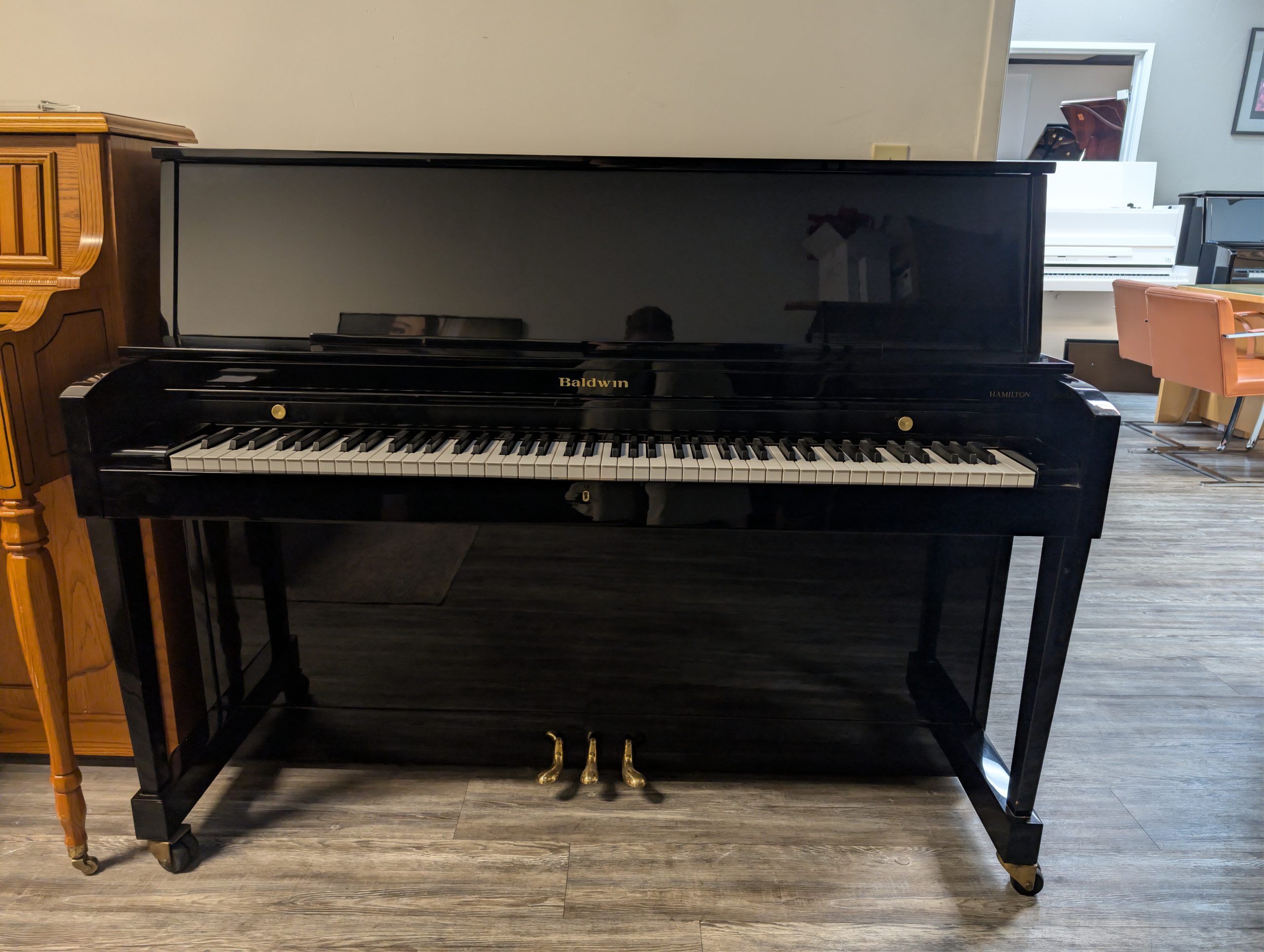 The Baldwin Hamilton piano is one of the most iconic upright models in American piano history, originally introduced by the Baldwin Piano Company in 1939 as a studio‑class upright designed for wide use in schools, churches, studios, and homes. Since its debut, the Hamilton series has become Baldwin’s best‑selling model of all time, thanks to its robust construction, reliable action, and full, resonant tone that approaches the dynamic qualities of larger instruments. These pianos typically feature a solid spruce soundboard, durable multi‑ply maple pin block for superior tuning stability, and Baldwin’s dependable action, making them suitable for both educational institutions and serious pianists. Over many decades, the Hamilton has been praised for combining classic American craftsmanship with rugged durability and expressive musical performance, securing its place as a staple among upright pianos.