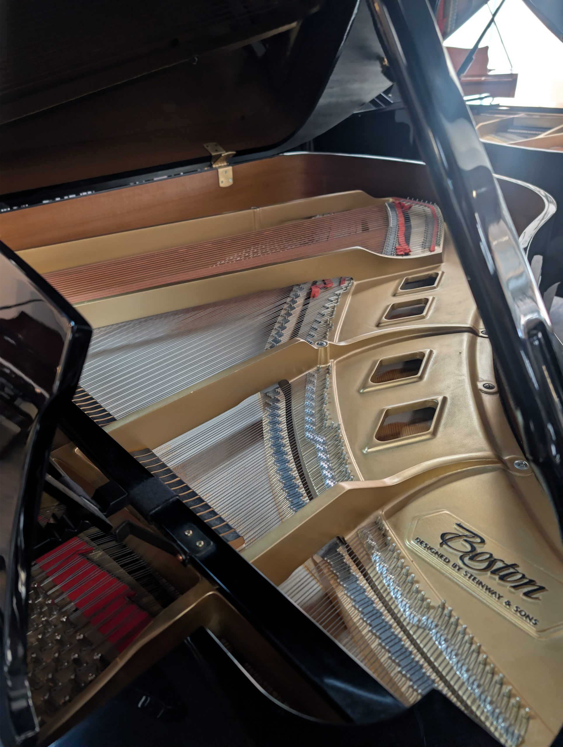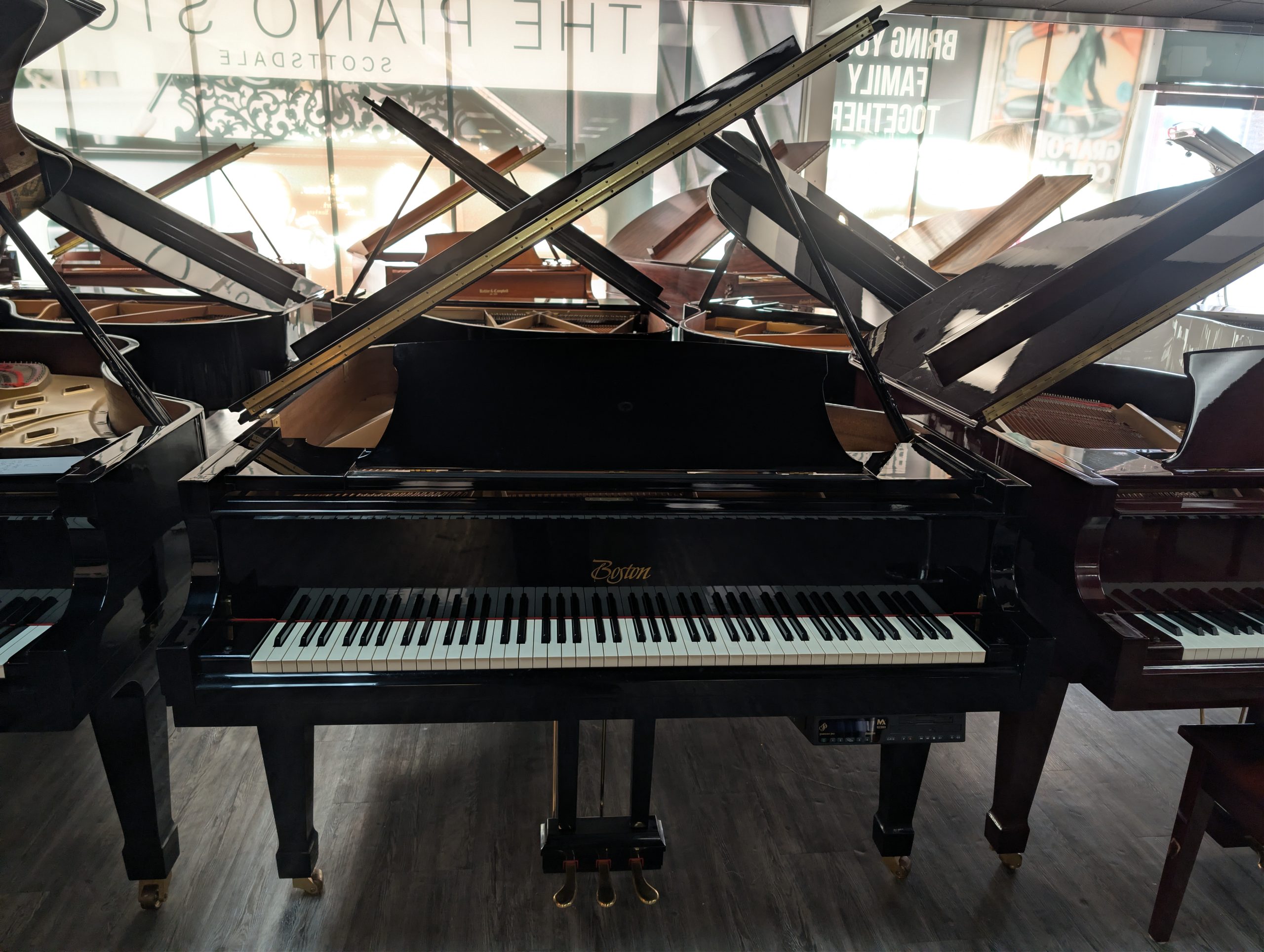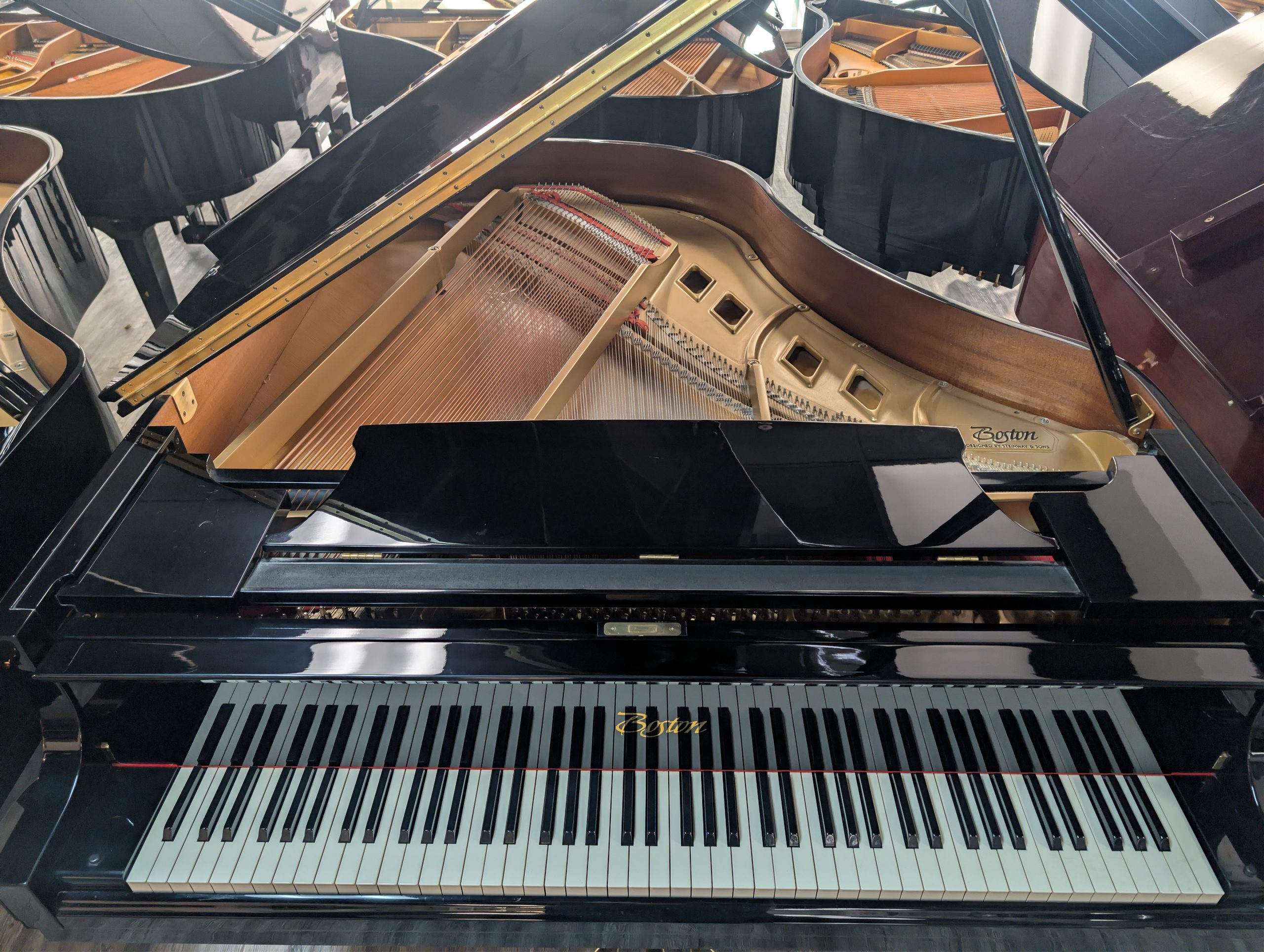 The Steinway Boston GP-178 5’10” Player Grand Piano is a variant of the popular Boston performance grand that adds an integrated player piano system, such as PianoDisc or a similar reproducing mechanism, giving the instrument the ability to automatically play back performances and enhance practice or entertainment options in addition to its acoustic capabilities. The base model, the Boston GP‑178, is a 5′10″ (178 cm) grand piano designed by Steinway & Sons and built in Japan (often by Kawai to Steinway’s specifications), and it features a wide‑tail design that increases soundboard area for richer tone and greater projection than typical pianos in its length class. Its construction includes a solid Sitka spruce soundboard, hard rock maple inner rim, and a lower string tension scale for longer sustain and a singing quality of tone, making it a strong choice for studios, homes, and advancing pianists seeking Steinway‑designed performance at a more accessible level. Adding the player edition lets the piano record and reproduce performances, combining acoustic tradition with modern convenience for learning and listening experiences.